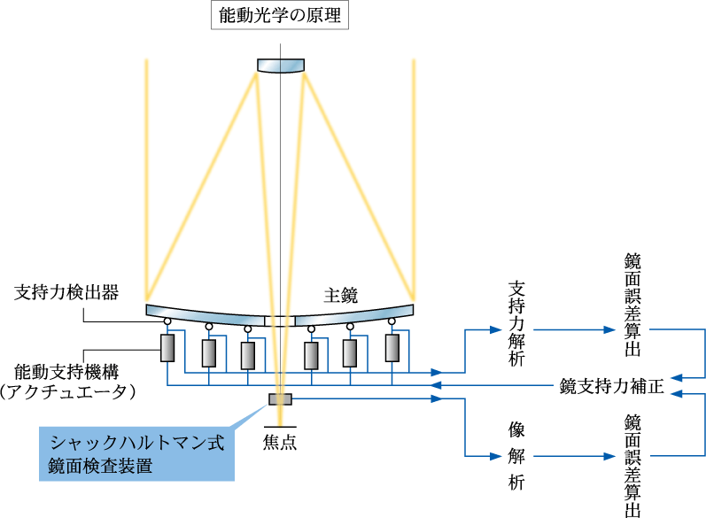 望遠鏡の光学系を実時間制御して最適化する技術。特に大型望遠鏡の主鏡の形状を姿勢や温度が変化しても保てるようにするため開発された。すばる望遠鏡の主鏡の能動光学システムでは、主鏡を支える261本の力支持機構(アクチュエータ)の支持力分布が最適になるようコンピュータで時々刻々制御される。各支持点の支持力は超精密力センサーにより誤差1グラム重の精度で測定し制御する。支持力分布が最適になっているかどうかは、実際の星像をシャックハルトマンセンサーで時々測って確認する。この考え方を拡張して、より応答速度が速い小型の可変形鏡を高速制御して、大気のゆらぎによるシーイングの悪さを克服する技術を補償光学と呼ぶ。